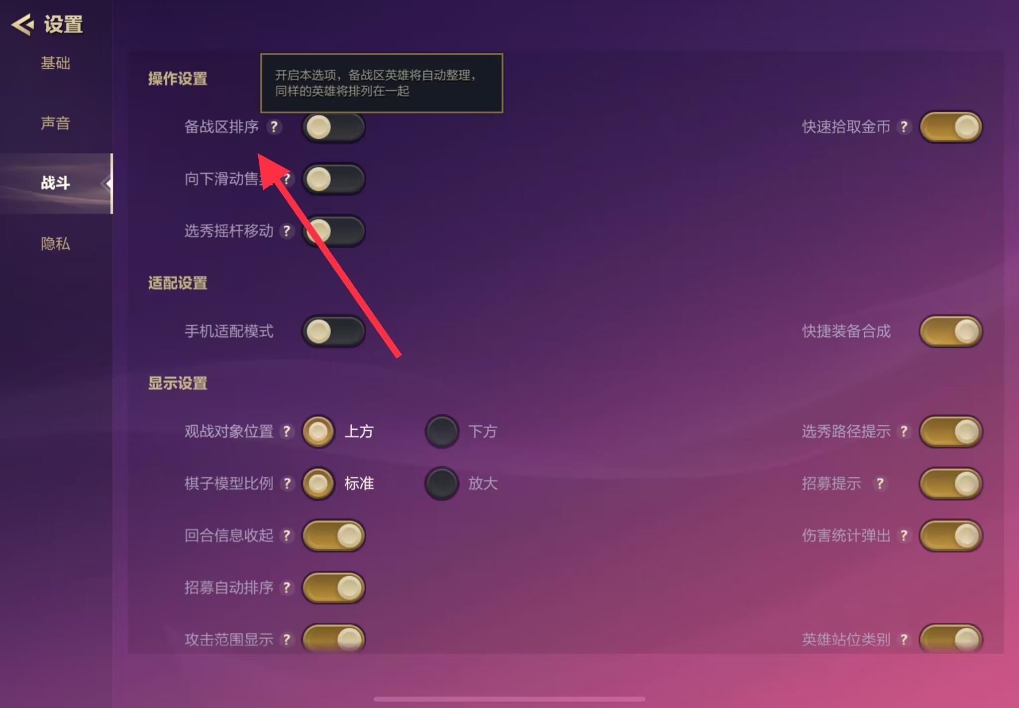 3、在设置左侧点击战斗,将备战区排序关闭即可关闭英雄自动上场,如下图所示。