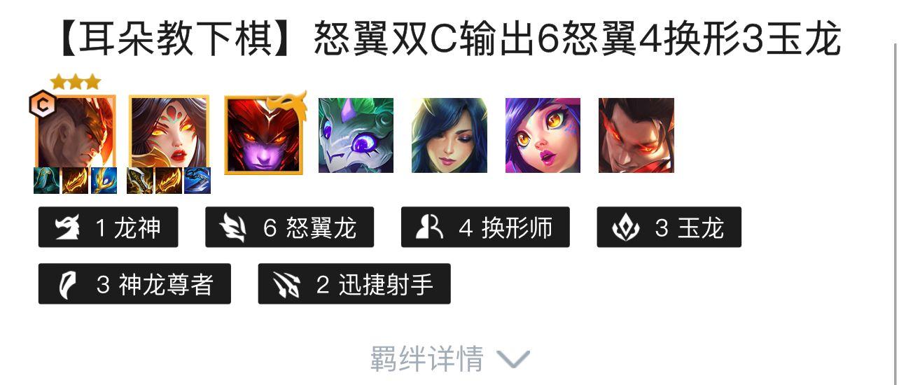 1、在金铲铲之战s7赛季中,怒翼龙阵容推荐玩耳朵教下棋,是由1龙神、6怒翼龙、4换形师、3玉龙、3神龙尊者、2迅捷射手组成。