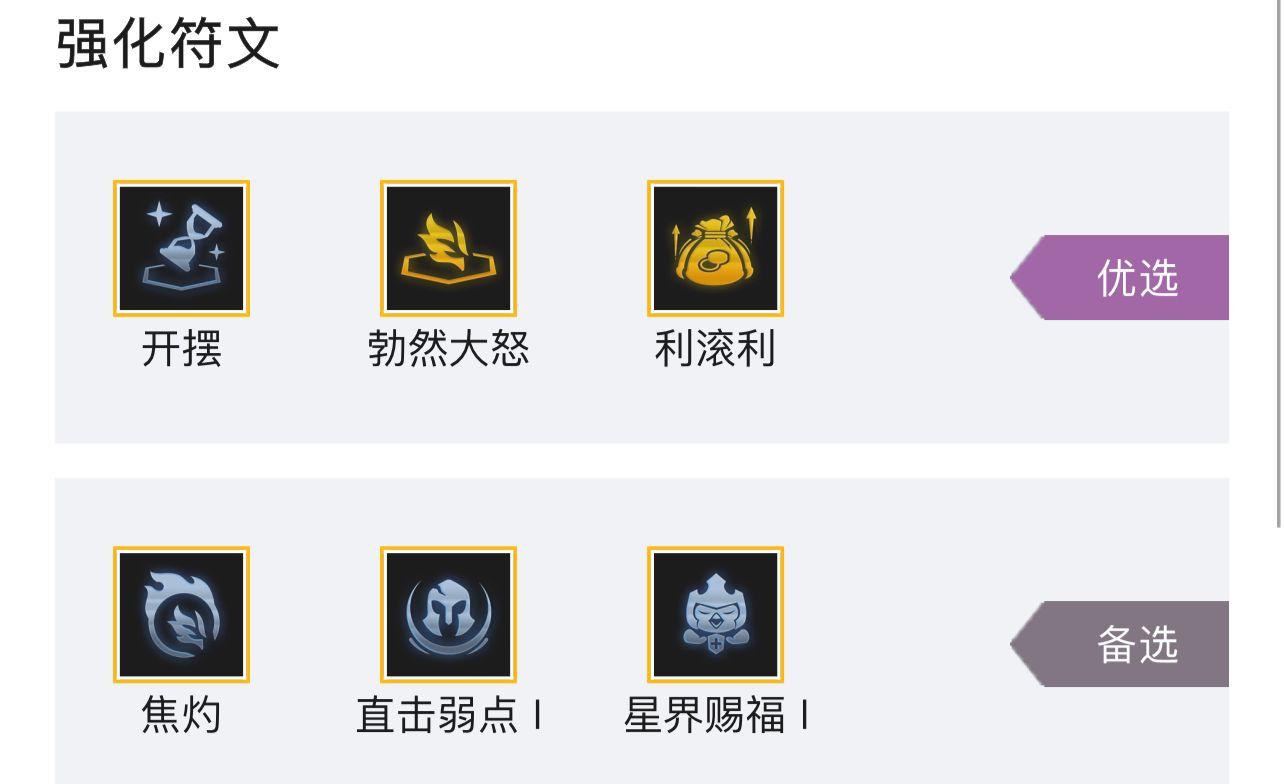 2、强化符文优选开摆、勃然大怒、利滚利,备选焦灼、直击弱点1、星界赐福1