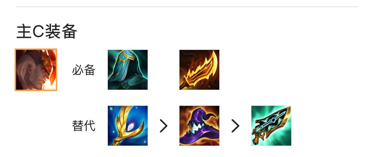 3、主C斯维因的必备装备是水银、鬼索的狂暴之刃,替代装备是大天使之杖、班克斯的魔法帽、海克斯科技枪刃。