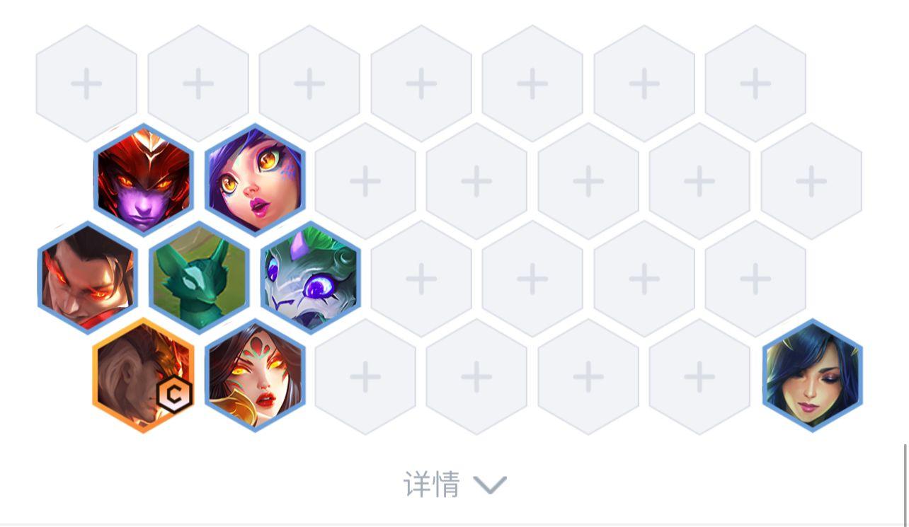 6、中期阵容:慎带着石像鬼石板甲打工,瑟提、慎、纳尔、卡尔玛、伊泽瑞尔、斯维因围着玉猫雕像,艾希在左下角输出,站位如下图所示。