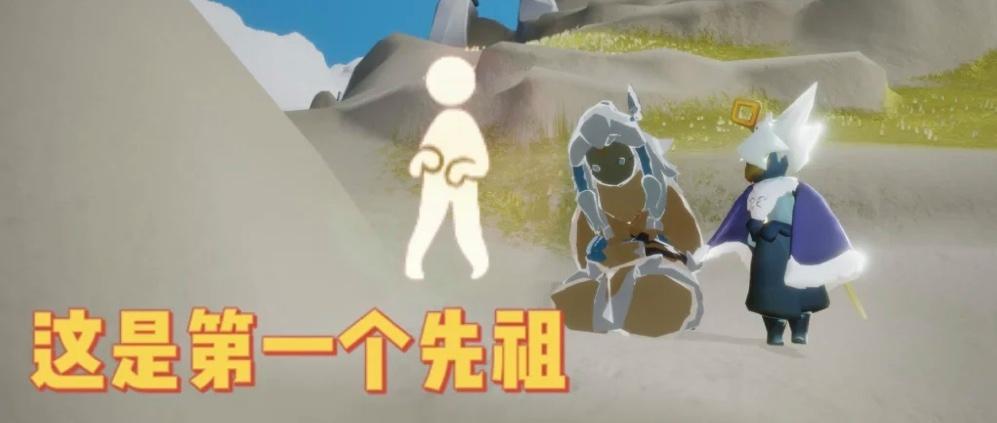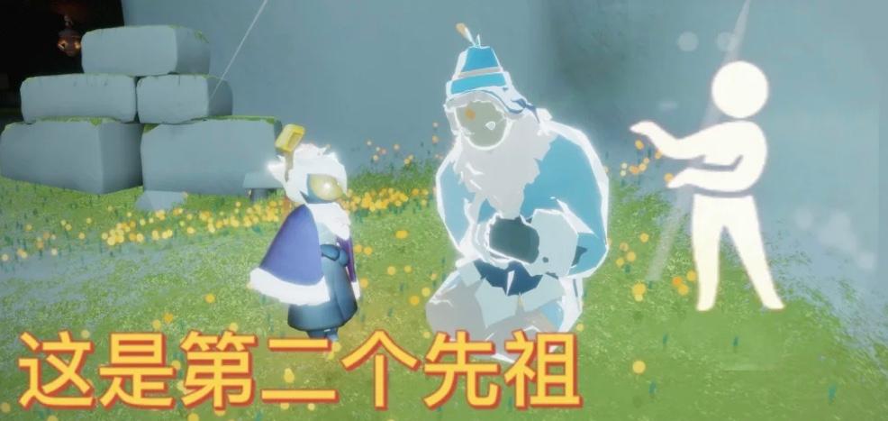2、接着向右边的小岛屿上飞,在这个小岛屿上会有一位先祖,这位先祖是一个动作先祖,像是在展示着什么东西。