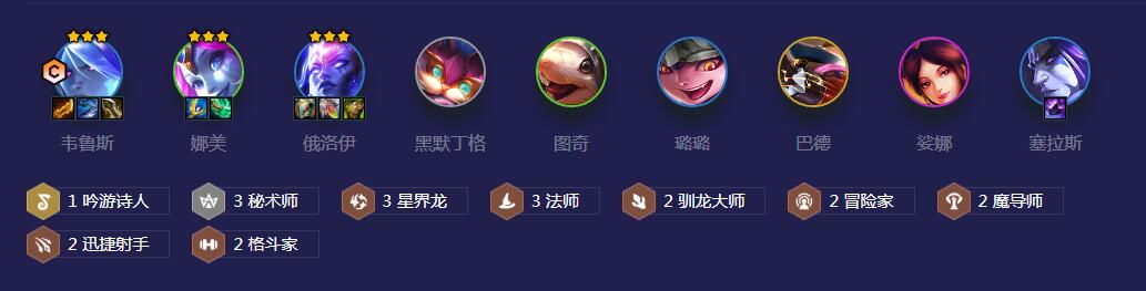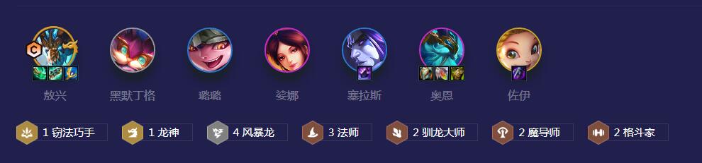 2、还有就是4风暴龙3法师2驯龙阵容,此阵容特点是伤害巨高,启动直接融化。所以前排要能抗住,等待熬兴放技能。优秀的驯龙过渡,搭配娜美三星界非常容易高血量来到8人口,但是同行很多需要把握节奏提前搜牌。并且没有传送门的情况下惧怕刺客。