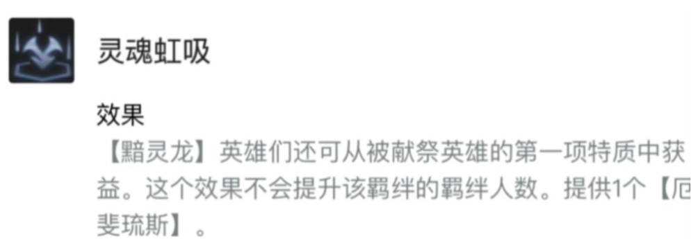 在金铲铲之战游戏当中,灵魂虹吸效果是黯灵龙英雄们还可从被献祭英雄的第一项特质中获益。这个效果不会提升该羁绊的羁绊人数,并且提供1个厄斐琉斯。