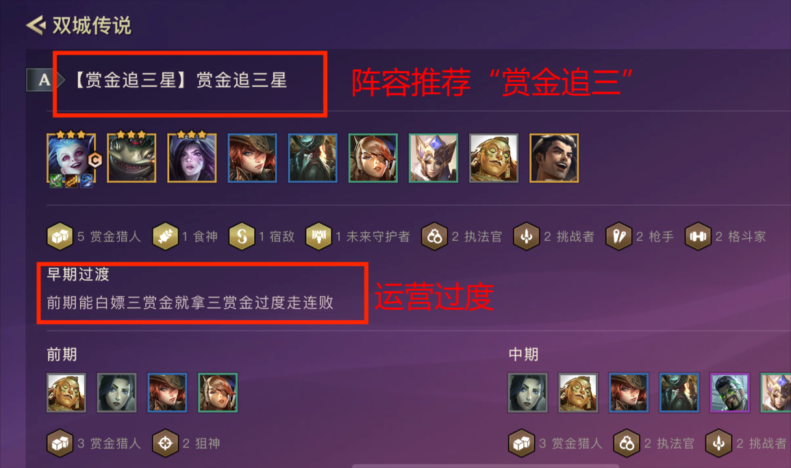 赏金阵容推荐为“赏金追三”,使用金克丝 塔姆 卡莎 女枪 船长 奎因 猪妹 海兽祭师 杰斯,组成5赏金1食神1宿敌1未来守护者2执法2挑战2抢手2格斗家的羁绊。这个羁绊也可以算是多羁绊阵容了。前期能优先拿到三赏金就可以直接走连败吃利息,积累宝箱内容。如果后期天胡,那么就可以直接升9,D出三星五费牌英雄。