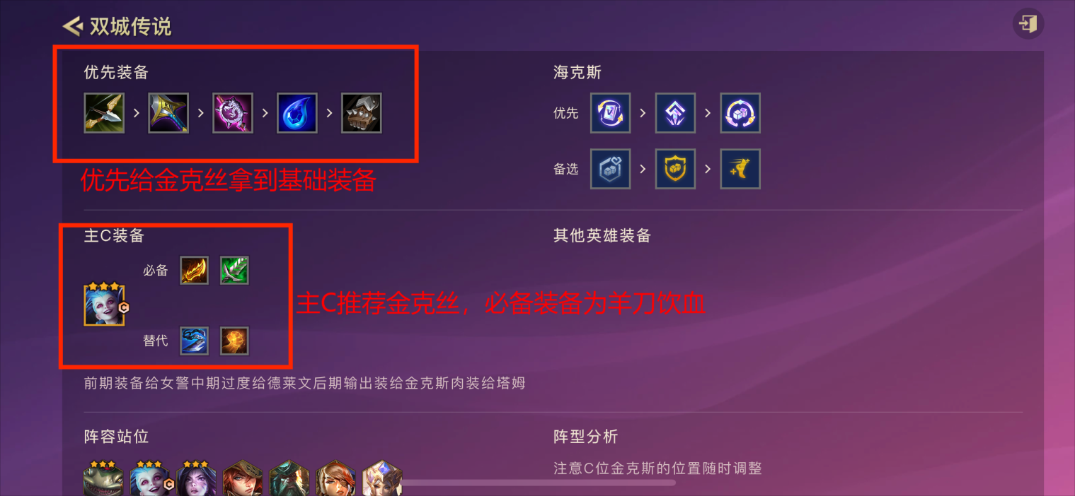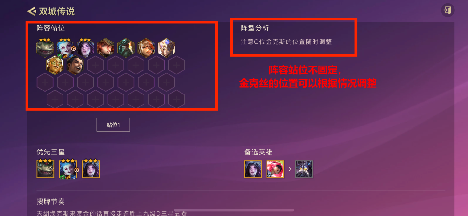 阵容站位塔姆、猪妹为前排,杰斯也可以作为备用前排使用,注意主要输出金克丝的位置,需要根据对局情况随时进行调整的,避免被对方第一时间切到。