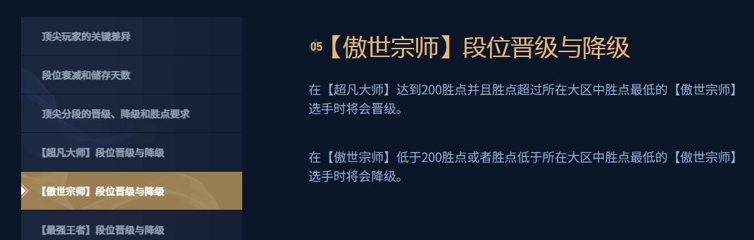 在【傲世宗师】低于200胜点或者胜点低于所在大区中胜点最低的【傲世宗师】选手时将会降级。所以如果玩家所处大区玩家水平较高时,会更容易掉出傲世宗师段位。