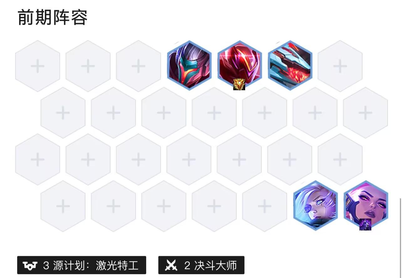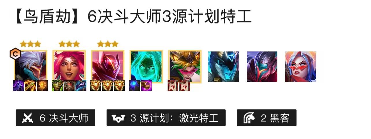 1、在金铲铲之战s8赛季中,源计划阵容是由6决斗大师、3源计划激光特工、2黑客组成。