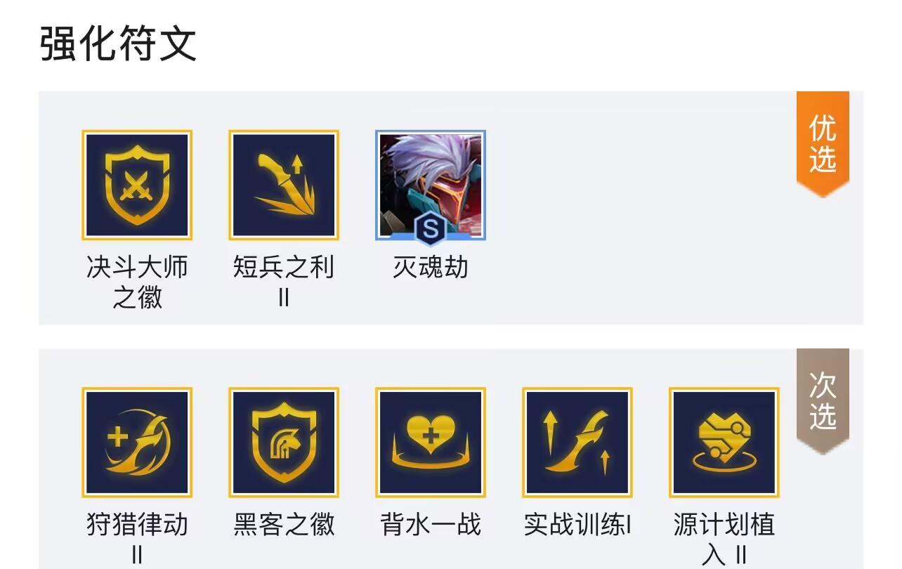 2、强化符文优选决斗大师之徽、短兵之利2、灭魂劫,次选狩猎律动2、黑客之徽、背水一战、实战训练1、源计划植入2