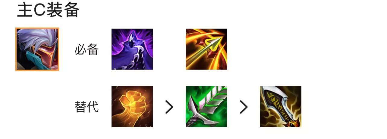 3、主C劫的必备装备是夜之锋刃、卢安娜的飓风,替代装备是正义之手、汲取剑、无尽之刃。