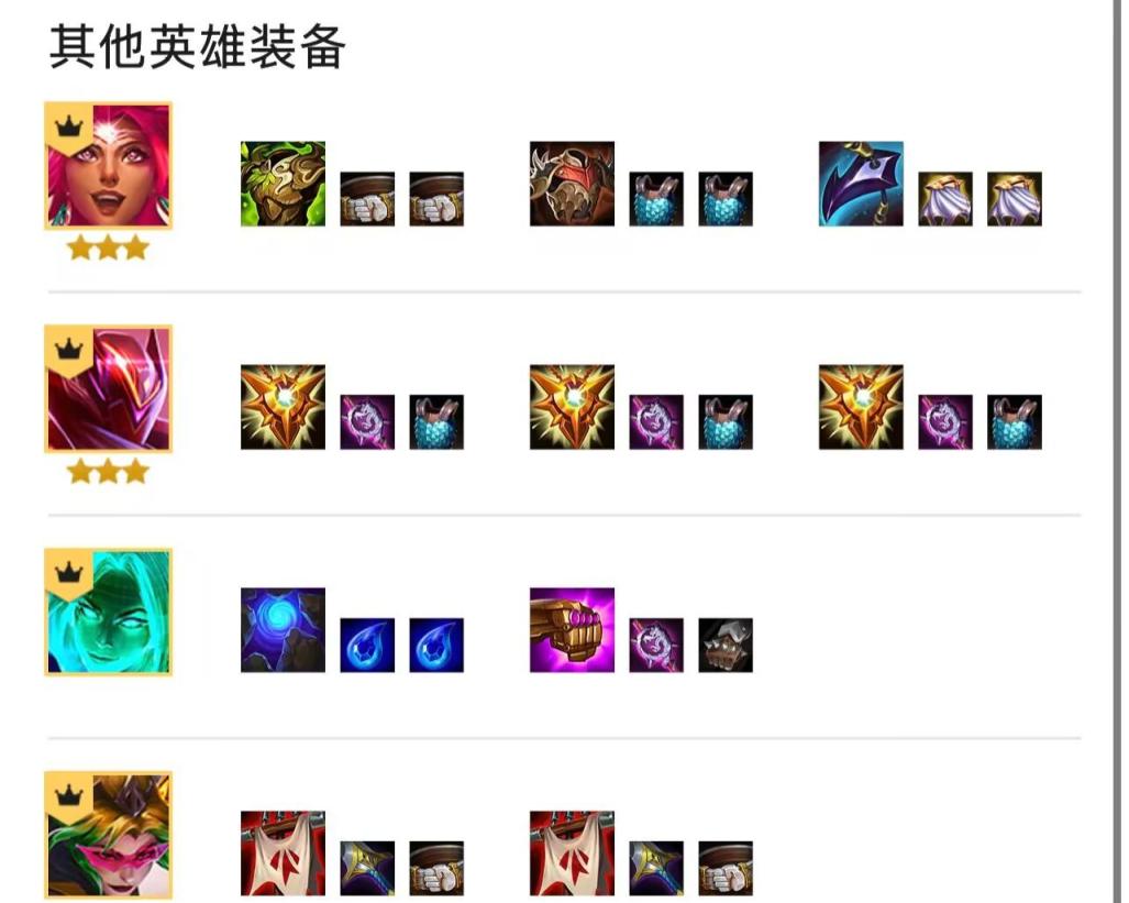 4、其他英雄装备:尼菈的装备是狂徒铠甲、荆棘背心、巨龙之爪,普朗克的装备是3个钢铁烈阳之匣,乐芙兰的装备是蓝霸符、珠光护手,薇恩的装备是2个基克的先驱。
