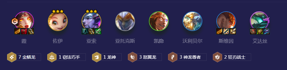 1、7金鳞龙阵容:霞、佐伊、亚索、剑魔、凯隐、狗熊、乌鸦、艾达丝。三星前比较怕屠龙刺客,风暴95,三星后都是弟弟,成型后稳吃鸡。