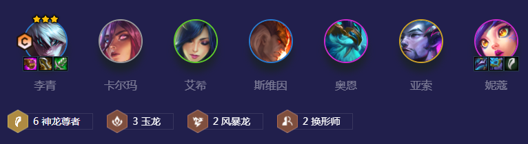 2、核弹神龙李青:李青、卡尔玛、艾希、乌鸦、奥恩、亚索、妮蔻。7人口六神龙二星李青神装就能锁血,4,5阶段无敌。吃分的神。