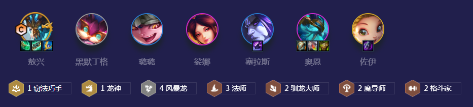 3、驯龙熬兴:敖兴、大头、璐璐、琴女、塞拉斯、奥恩、佐伊。此阵容特点是伤害巨高,启动直接融化。所以前排要能抗住,等待熬兴放技能,吃分能力很强。