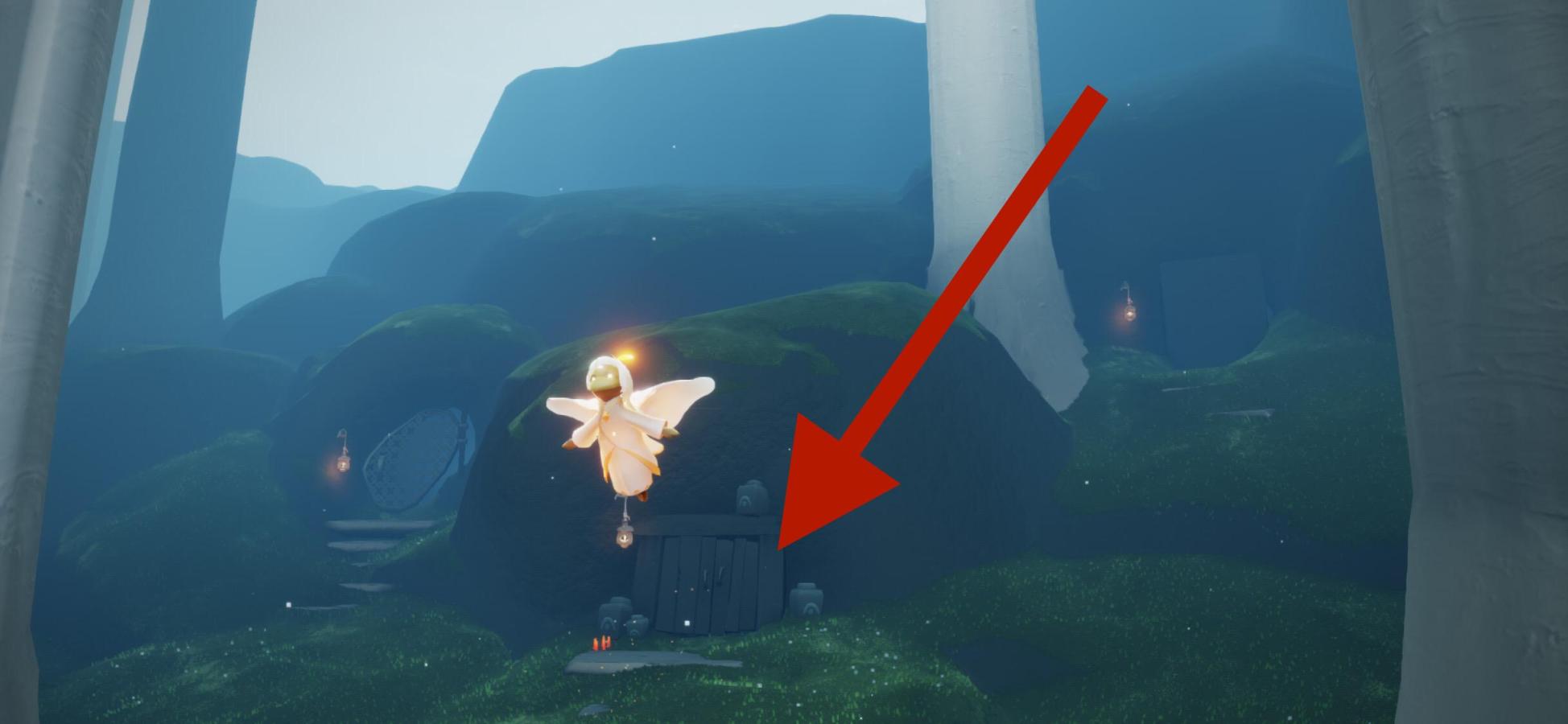 3、进图之后向前飞,在左侧可以看到三扇门,进入中间的木门。
