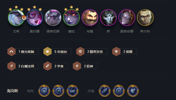 在金铲铲之战中,艾希最好搭配莫甘娜、德莱厄斯、婕拉、布隆、烬、奥利安娜和希尔科,这样能凑成5辛迪加2狙神2白魔,辛迪加寒冰,S6.5的版本答案。辛迪加自带加双抗吸血,整体非常肉,控制也很多,寒冰场均万伤,整体强度非常高,而且赌2费寒冰,成型非常快,又很稳定,基本可以把把强行玩。