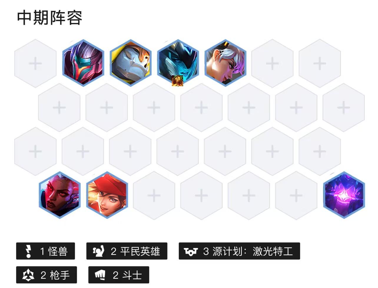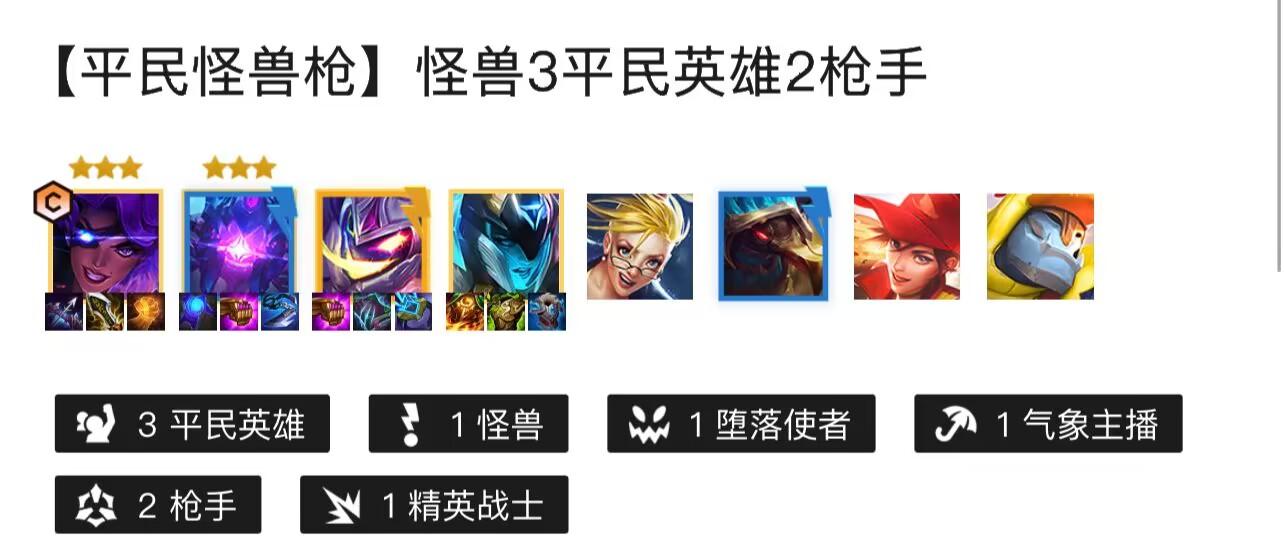 1、在金铲铲之战s8赛季中,怪兽阵容是由3平民英雄、1怪兽、1坠落使者、1气象主播、2枪手、1精英战士组成。