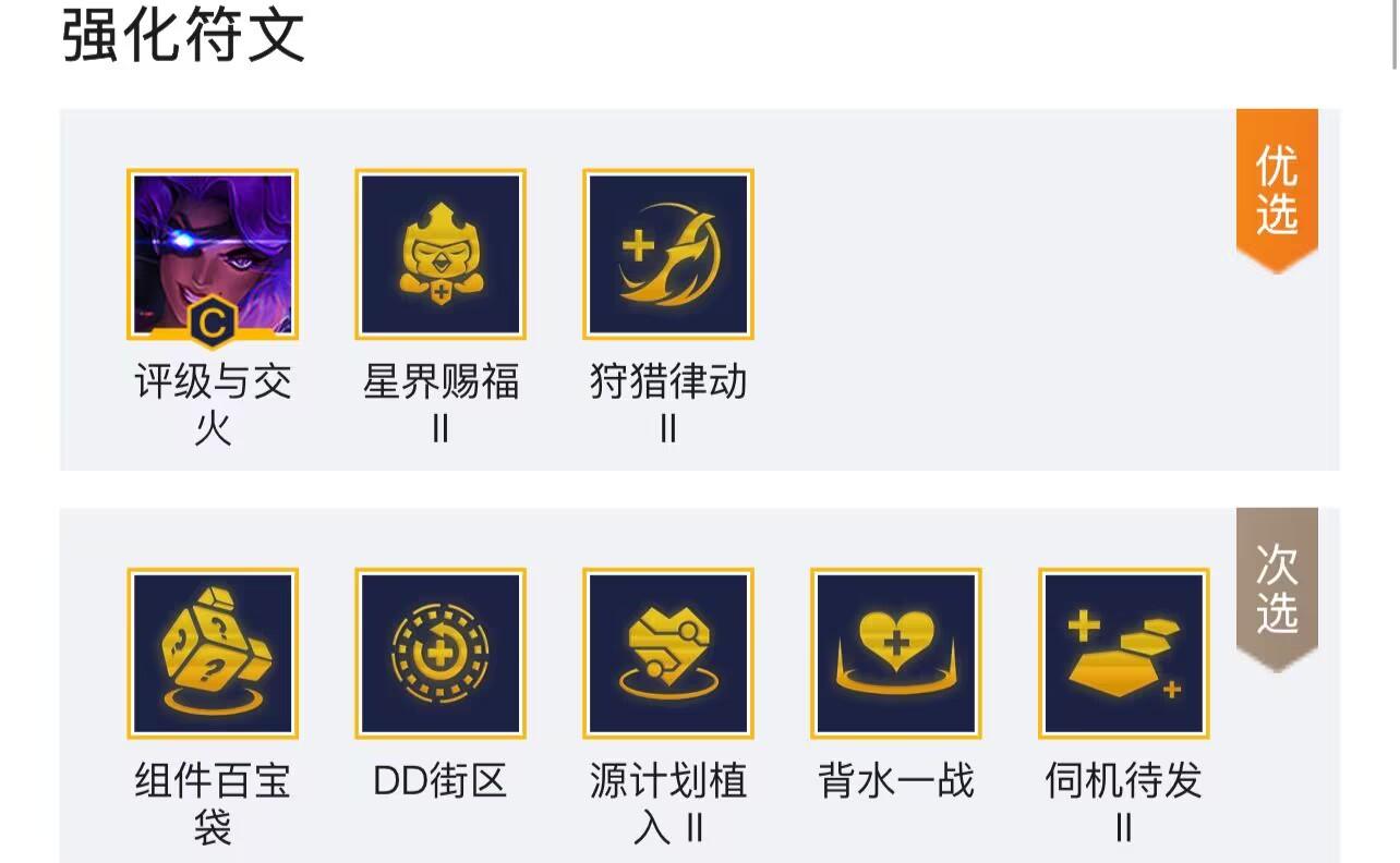 2、强化符文优选评级与交火、星界赐福2、狩猎律动2,次选组件百宝袋、DD街区、源计划植入2、背水一战、伺机待发。