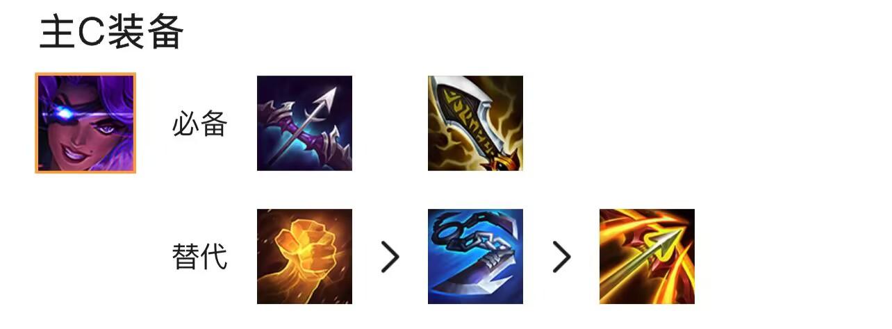3、主C莎弥拉的必备装备是轻语、无尽,替代装备是正义之手、巨杀、卢安娜的飓风。