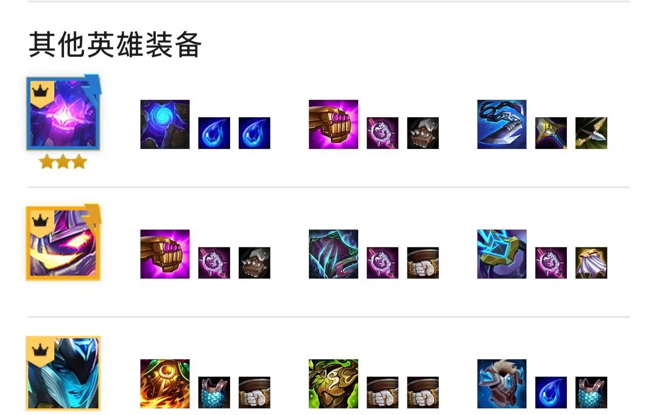 4、其他英雄装备:维克兹的装备是蓝霸符、珠光护手、巨杀,稻草人的装备是珠光护手、莫雷洛法典、离子火花,瑟庄妮的装备是日炎披风、狂徒铠甲、冰霜之心。