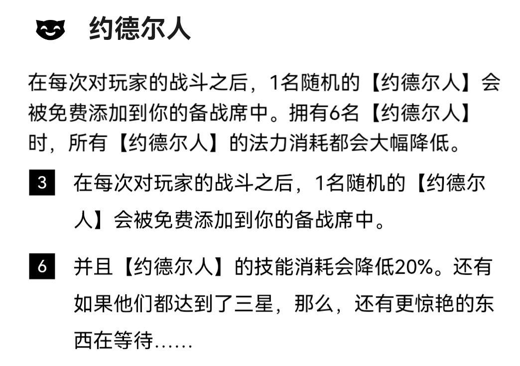 2、当六名约德尔人全部三星后,就会触发隐藏效果下一回合系统就会送给你约德尔大王维迦,每回合都会有直至你的小法师升到三星。