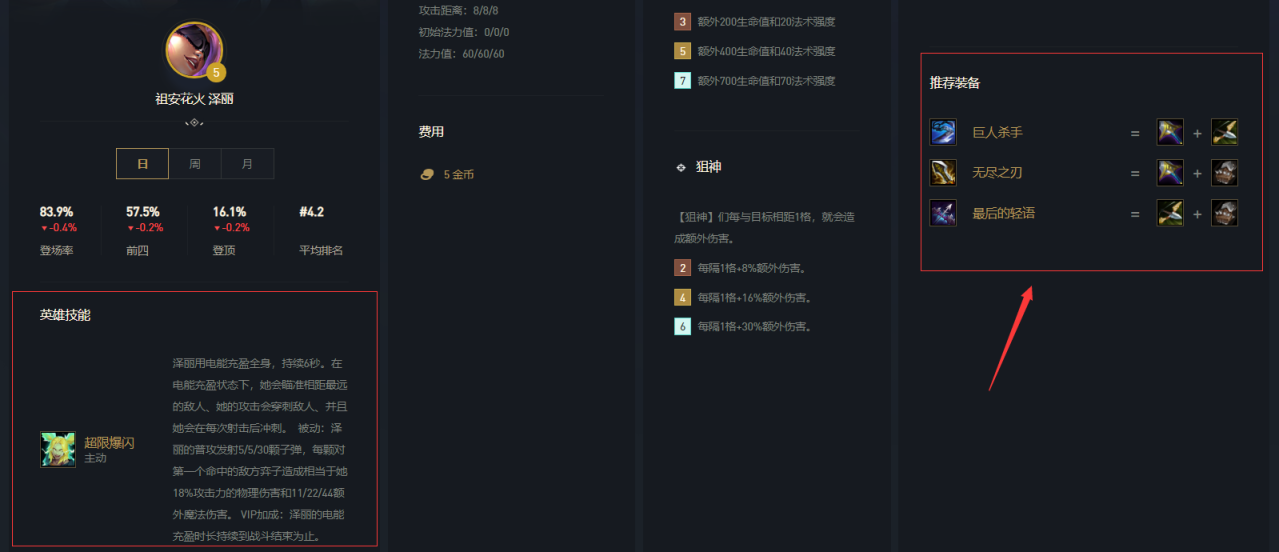 金铲铲之战中泽丽作为狙神,是阵容中的主要物理输出,因此推荐的装备为巨人的杀手,无尽之刃和最后的轻语,玩家可以根据自己的装备进行调节。