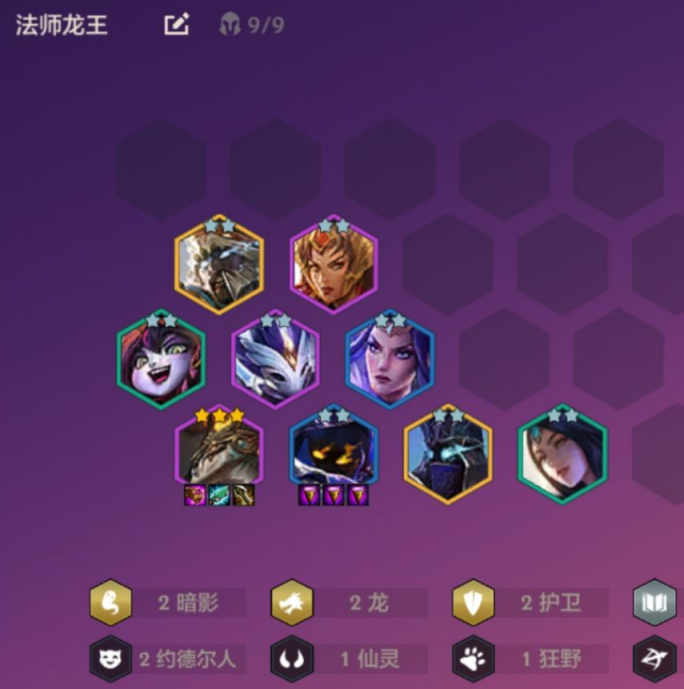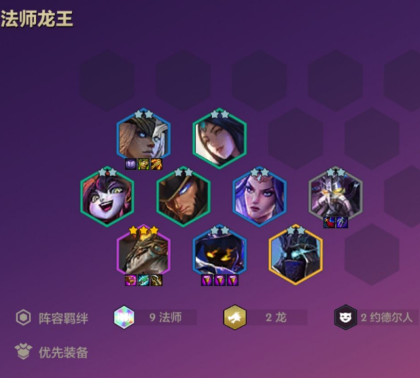 1.阵容组成:卡萨丁,狐狸,露露,卡牌,小法,龙王,死歌,法转组成九法师,加上龙女组成2龙,后期龙女换潘森。