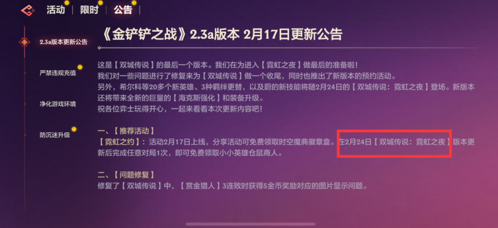 本次的金铲铲之战游戏霓虹之夜会在2月24号正式上线,也就是还有几天的时间,除此以外,官方还常规地删除和增加了一些羁绊,还有棋子,变更了赛季风格,非常值得期待。