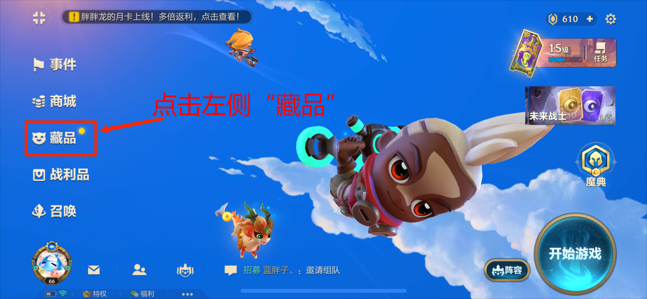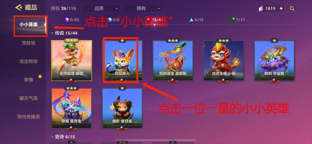 2.进入藏品后,点击左侧“小小英雄”;选择一个一星小小英雄;