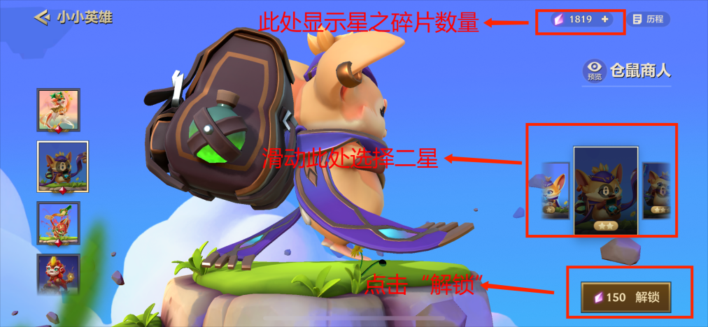 3.选择小小英雄后,右侧选择该小小英雄的二星状态,点击“解锁”;