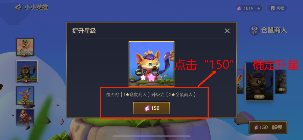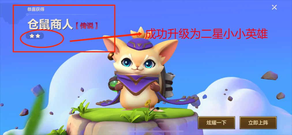 5.点击“150”后,会显示“恭喜获得”小小英雄,成功升星。