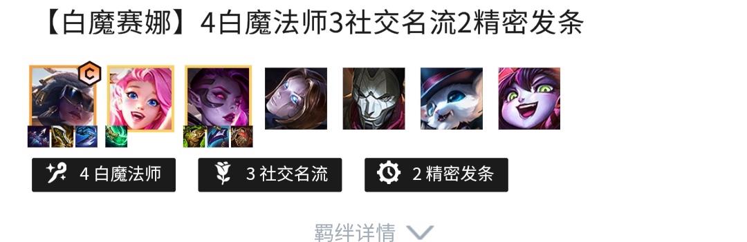 1.云顶之弈中白魔赛娜的阵容是以赛娜为主C,前排为莫甘娜,再加上萨勒芬妮,奥利安娜,烬,纳尔,璐璐七人组成4白魔法师,3社交名流,2精密发条。