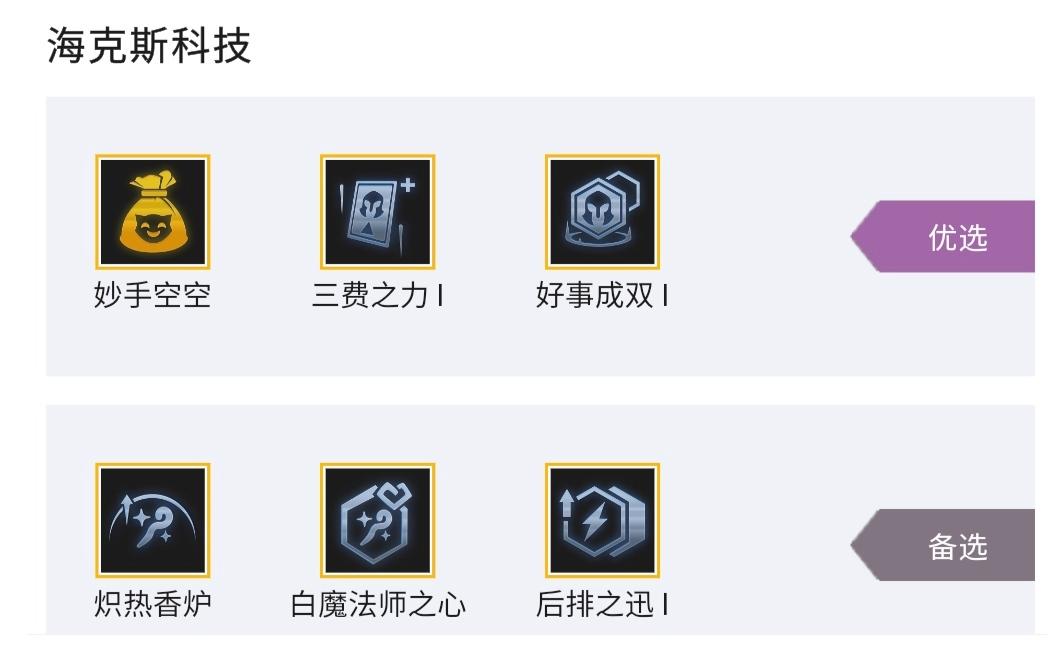 2.该阵容海克斯优选妙手空空,三费之力和好事成双,其次可以选炽热香炉,白魔法师之心和后排之迅。