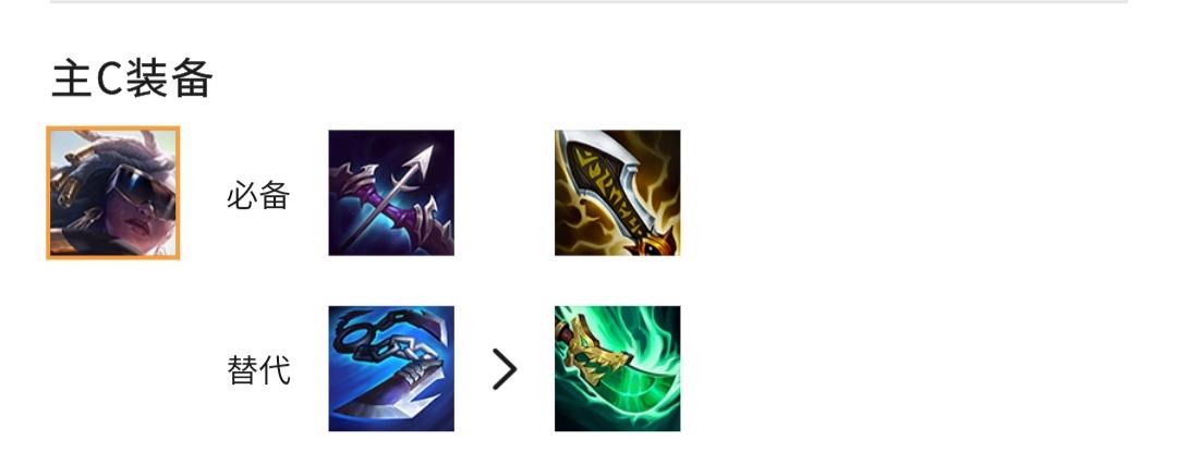 3.主C必备装备为最后的轻语和无尽之刃,其次选巨杀和青龙刀。
