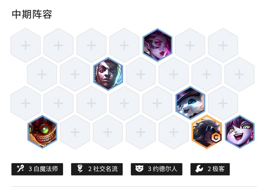 7.中期在六级的时候小滴一波,凑出3白魔法师,3约德尔人,2社交名流,2极客阵容,这样既可以稳定经济,又能保持连胜。