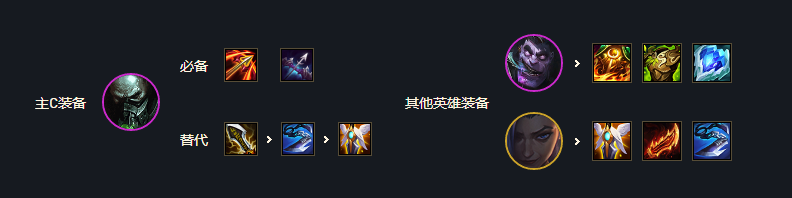 2、装备的分配。在装备的分别上自然是输出装备给枪手主C,防御装备给前排选手。当前版本因为坦克强度较高,破甲弓是必须要出的。