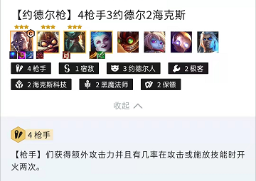 2、阵容组成羁绊:4枪手、3约德尔、2海克斯、2极客、2保镖、2黑魔。
