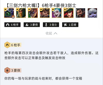 2、组成羁绊:6枪手、4豪侠、3剑士。
