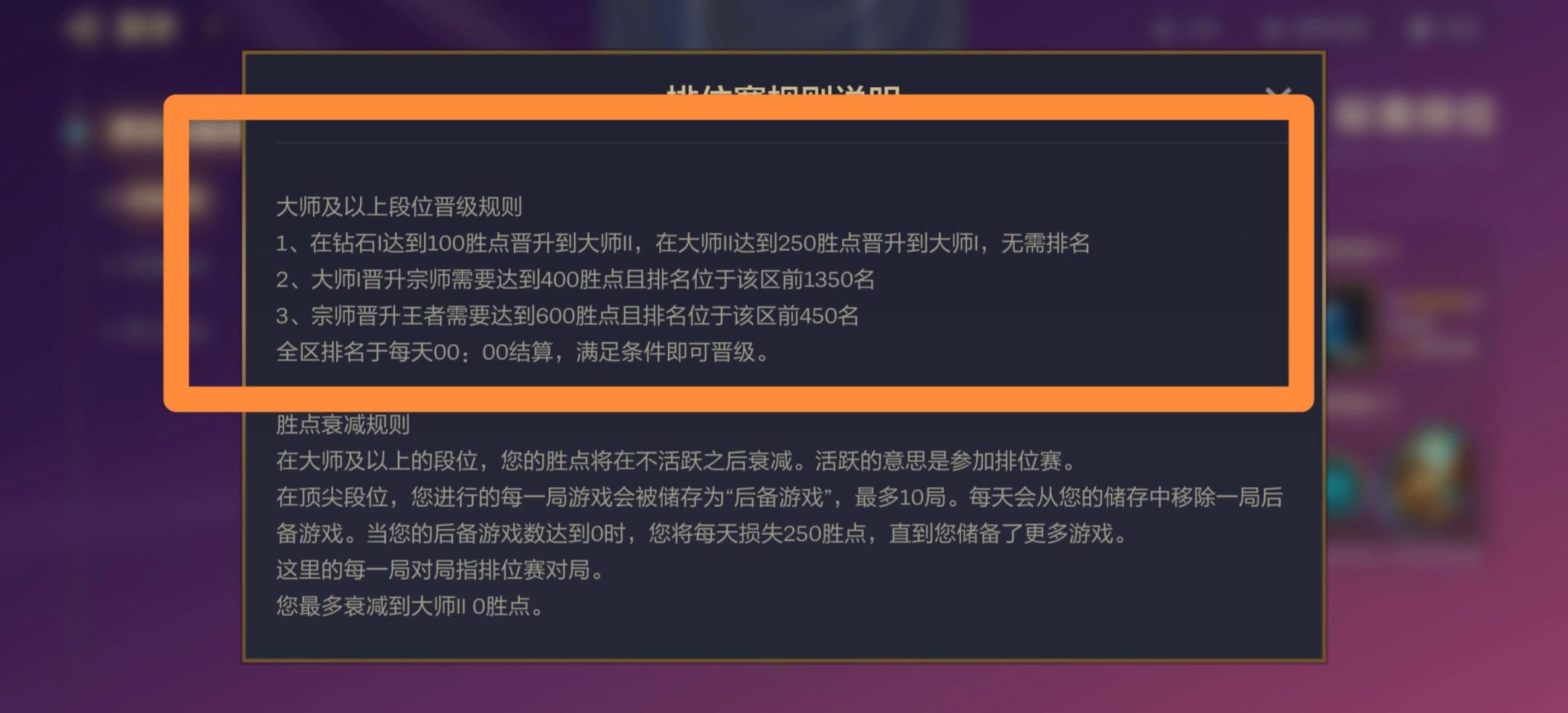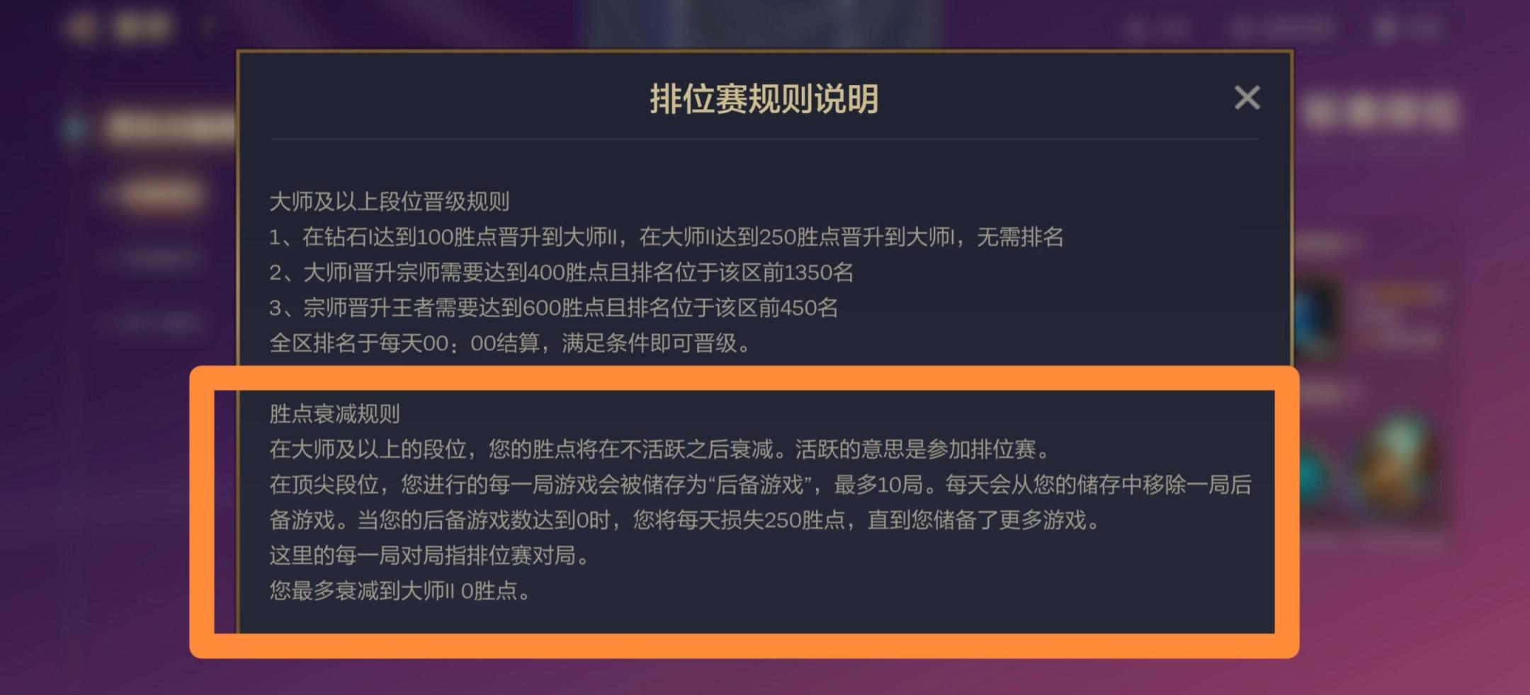 胜点衰减规则:在大师及以上的段位,您的胜点将在不活跃之后衰减。活跃的意思是参加排位赛。在顶尖段位,您进行的每一局游戏会被存为"后备游戏",最多10局。每天会从您的储存中移除一局后备游戏。当您的后备游戏数达到0时,您将每天损失250胜点,直到您储备了更多游戏。这里的每一局对局指排位赛对局。您最多衰减到大师II0胜点。