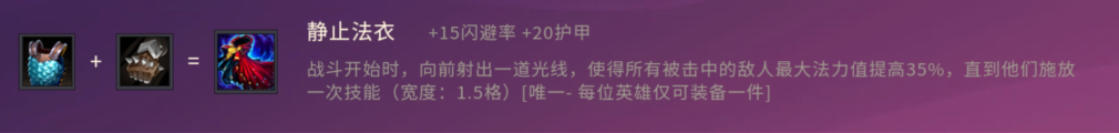 在《金铲铲之战》中,【静止法衣】这个装备的技能是“战斗开始时,向前射出一道光线,使得所有被击中的敌人最大法力值提高35%,直到他们施放一次技能。”简单来说就是被光线集中的敌人的第一个技能释放会十分慢。