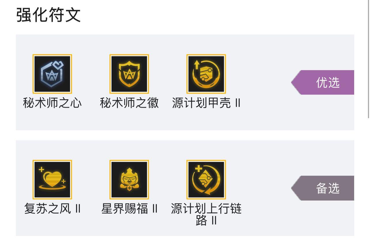 2、强化符文优选秘术师之心、秘术师之徽、源计划甲壳2,备选复苏之风2、星界赐福2、源计划上行链。
