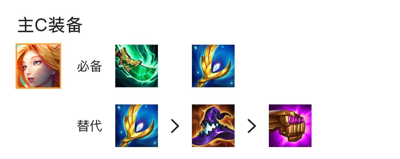 3、主C萨勒芬妮的必备装备是朔极之矛、大天使之杖,替代装备是大天使之杖、班克斯的魔法帽、珠光护手。