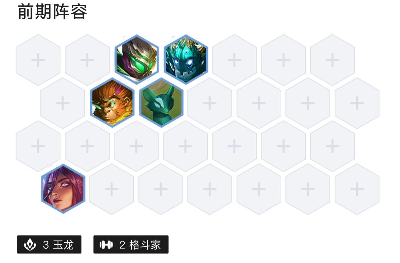 6、前期阵容:贾克斯、墨菲特在第一排抗伤,猴子、玉龙雕像在第二排输出,卡尔玛在最后一排输出。