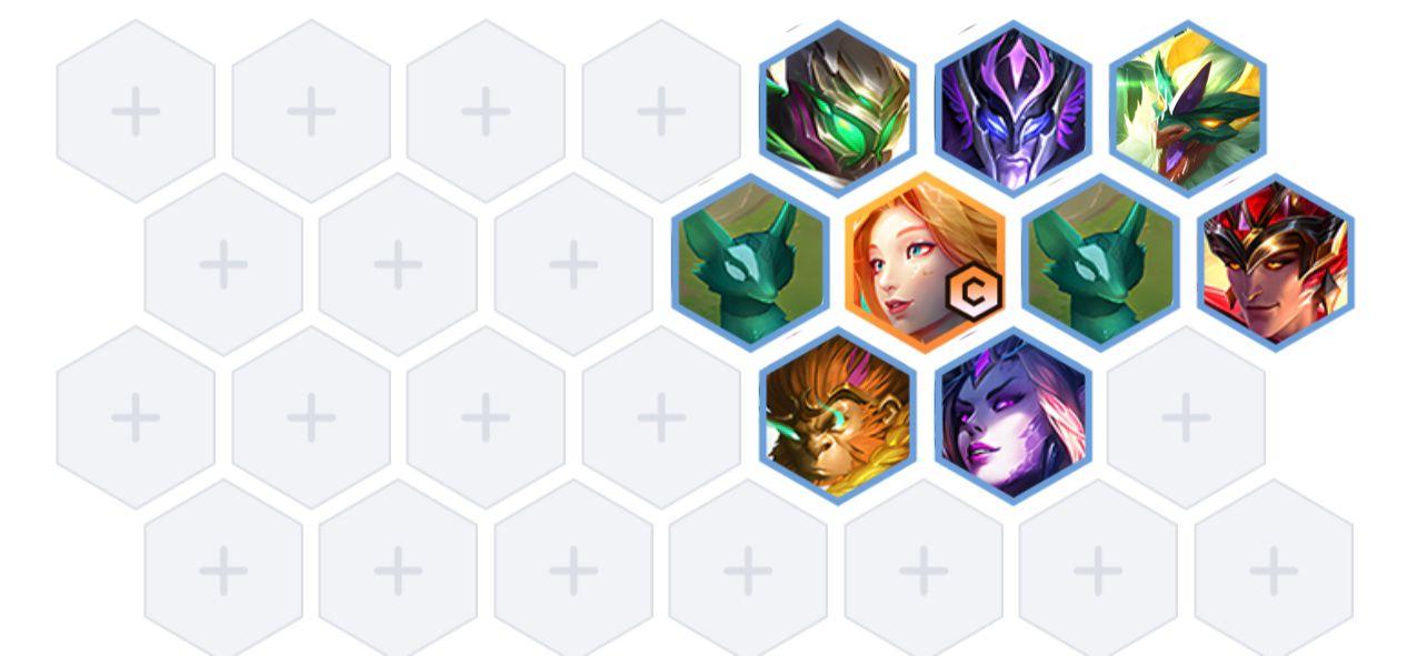 8、后期阵容:贾克斯、潘森、石傲玉在第一排抗伤,萨勒芬妮、洛在第二排输出,猴子、婕拉在第三排输出。