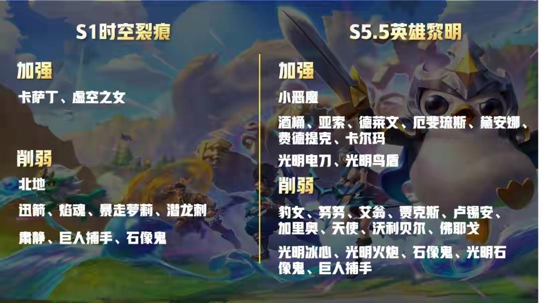 英雄黎明相比端游多削弱了最关键的天使和哨兵,加上大眼熊菊体系的削弱和贾克斯的削弱,这样版本最大的受益者彻底变成了德莱文、黎明刺、游侠,不太吃熊菊的梦魇刺也有所加强。