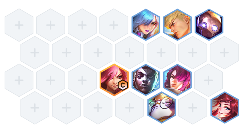 如上图所示:女坦,盖伦,机器放第一排放一起,可以吃到女坦的加双抗效果,机器可以灵活摆位勾人。战斗双刺不需要拉扯站位,永恩放下面一点避免被秒,艾克跳人群位置打群控场效果,卡特一般直接跳中间即可,不需要太刻意切人跳脸,她放大会优先斩杀血量低的单位。反而跳人群容易被控杀。艾克卡特最好放一起,艾克容易偷带基克女妖,给卡特吃到BUFF。然后左右摇摆,优先保证女坦抗到巨额伤害给队友加双抗。注意防吹风,永恩别被勾。猫挂永恩即可。如果有凌风,可以凌风吹防勾单位机器直接勾对面C位,操作空间很大。
