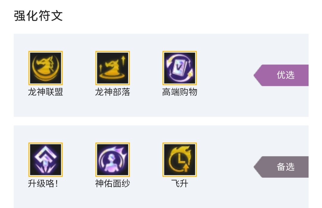 2.强化符文:优选龙神联盟,龙神部落和高端购物,但龙神联盟或者龙神部落是必须需要的该阵容,没有这两个符文不建议玩。其次玩家可以选择升级咯,在增加战力的符文中可以选择神佑面纱和飞升。