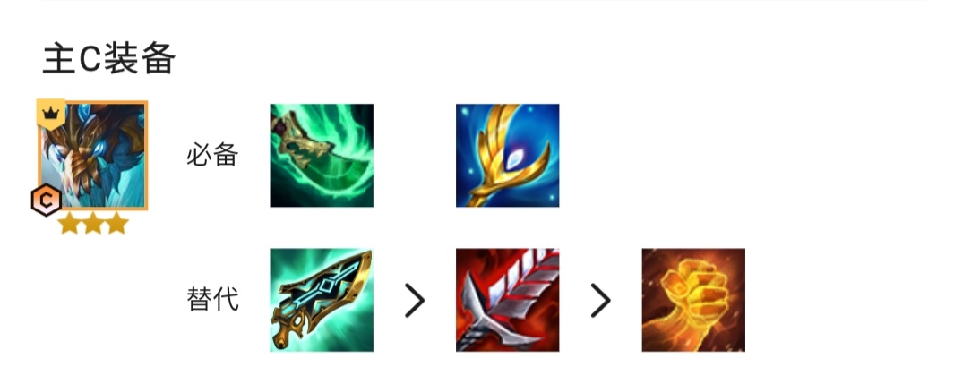 3.主C装备:熬兴必备装备为青龙刀和大天使之杖,青龙刀可以保证熬兴的启动,大天使之杖可以是一星熬兴时保持第二个大招收割战场的能力,第三件装备最好是科技枪,防止被AOE打死。其次也可以装备饮血剑或者正义之手也可以达到相同的效果。