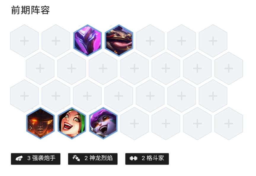 6.前期运营:2-1升四人口,2-4升五人口,前期需要保连胜,因此当阵容强度不足是可以直接拉五人口。用3炮手 2神龙烈焰 2格斗家过渡,前期大部分两星都能保证连胜。