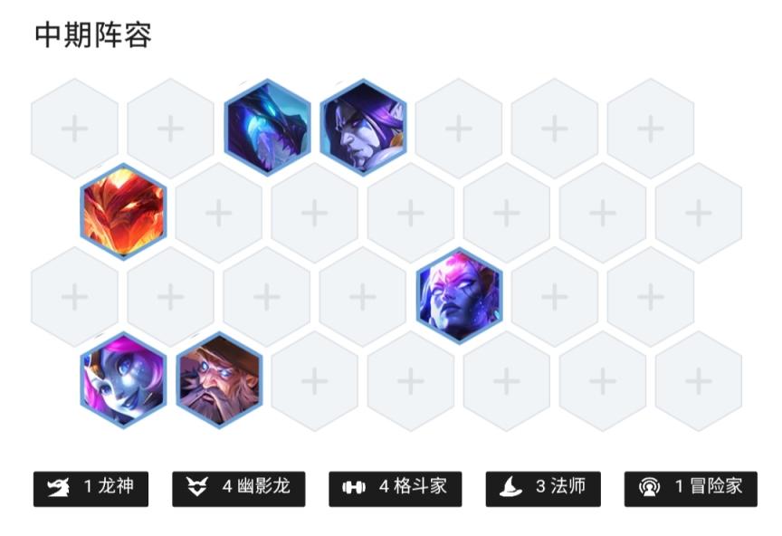 1.阵容搭配:以熬兴为主C,艾达丝为前排,赛芬为副C,再加上奥恩和锤石五人组成3龙神,4风暴龙,4幽影龙,3金鳞龙,2格斗家和2护卫羁绊阵容。